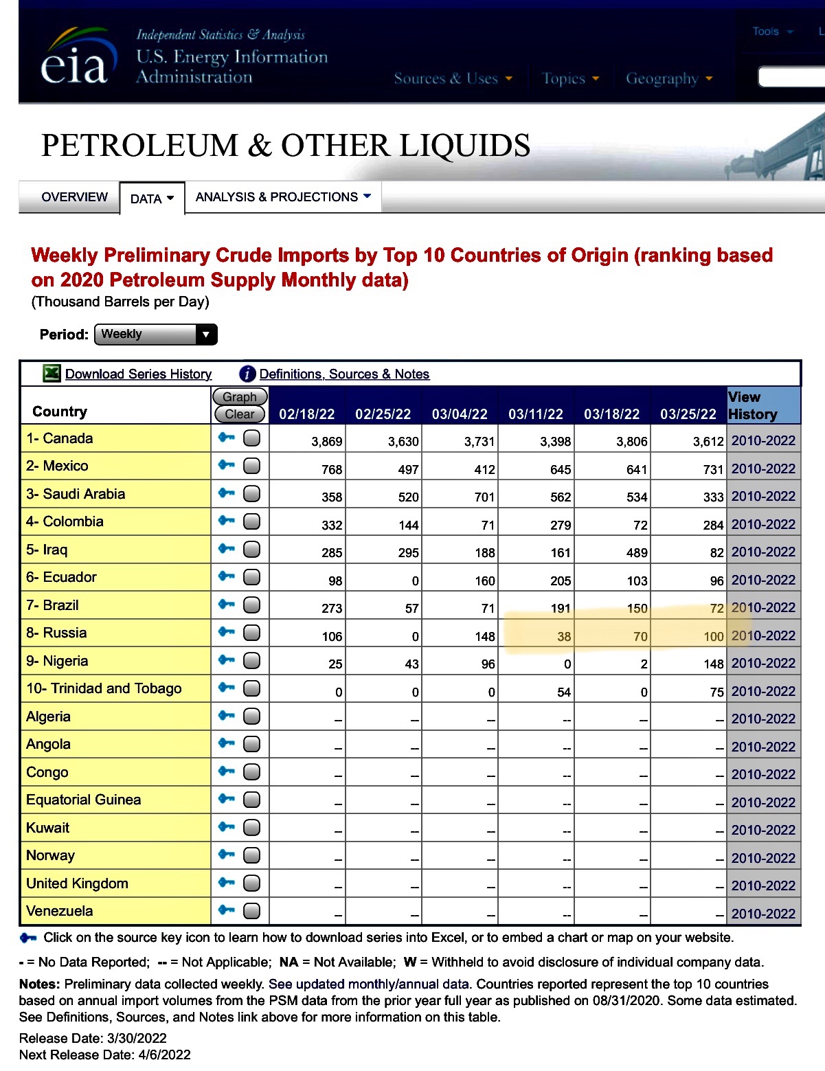 Und während in DEUTSCHLAND ein Energieembargo mit unkalkulierbaren sozioökonomischen Folgen diskutiert wird, sieht es im Bericht der US-Energiebehörde so aus, als hätten die USA ihre Rohöl-Importe aus Russland in der letzten Woche auf 100.000 Barrel am Tag gesteigert.