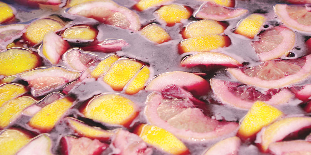 Für einen weißen Sangría nimmt man vorzugsweise einen halbtrockenen Wein, um sich den Zuckerzusatz zu ersparen und fügt Früchte wie Melone, Pfirsich und Limette oder Stachelbeeren, ja sogar weiße Trauben hinzu. Bei allen Versionen bietet sich indes an, eine Art Konzentrat über Nacht ziehen zu lassen. Anschließend beim Servieren dann aufzugießen und mit frischen Obststückchen aufmöbeln. Das Konzentrat verträgt mitunter sogar mehrere Aufgüsse.