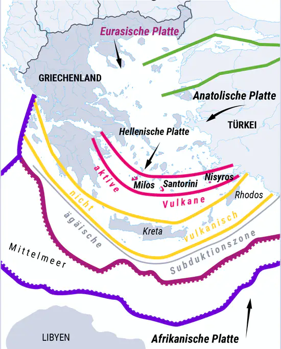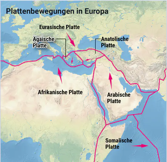 Dass gerade in der Region zwischen Griechenland und der Türkei so oft die Erde bebt, hängt mit der Lage zusammen. Denn in der Ägäis treffen mehrere tektonische Platten aufeinander. Die Eurasische Platte im Nordwesten, die Anatolische Platte im Osten, die Afrikanische Platte im Süden und in der Mitte die Ägäische Platte. Dabei treibt die Eurasische Platte auf die Afrikanische Platte zu. Die nach Osten gerichteten Kräfte erzeugen in Mitteleuropa im Untergrund ein Spannungsfeld, welches die Nordwärtsbewegung der Afrikanischen Platte erheblich hemmt. An der Afrikanischen Platte hängt zudem ein Fortsatz, Adriatischer oder auch Apulischer Sporn genannt, der sich in die Eurasische Platte schiebt.